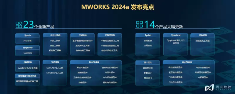 过去几年,同元软控围绕行业应用需求和装备数字化需求,持续迭代完善MWORKS。2024年,MWORKS完成了里程碑的重大升级,系统建模仿真内核五年重构,框图建模与代码生成突破窠臼,科学计算大量创新,工具箱家族不断扩大。2月25日,MWORKS 2024a重装发布,重点推出6大重磅功能,全新发布23个新产品,大幅更新14个产品,平台累计已具备33个工具箱和29个模型库,端云一体自主化,与国产信创产品全面兼容,全面提升用户使用体验!