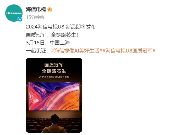 3月15日2024海信电视春季新品发布会,期待“画质冠军”隆重登场,为用户带来真正极致画质、音质、交互的“机皇”体验。