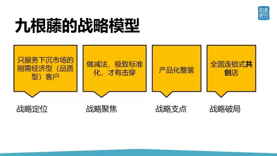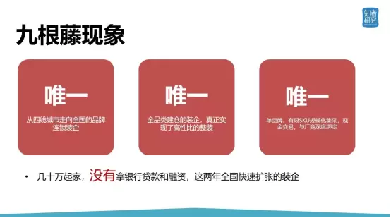 九根藤以产品化整装为战略支点,定位于服务下沉市场的刚需经济型客户,战略聚焦于给sku做减法,极致标准化,击穿市场,通过全国连锁式共创店进行破局,做出的一致性产品,让家装更简单。正是基于特别容易复制这一大特点,顺势开启了全国快速扩张之路。