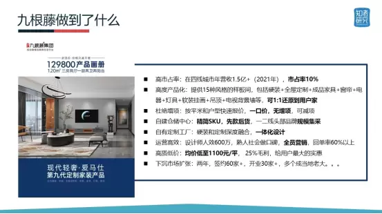 为了做极致产品化整装,九根藤前期做得很重,如打造极致供应链集成,省去中间所有环节,如总部将在每个省提供2-3个大型10000方城市中心仓,以提升交付效率,降低时间成本;自建定制工厂、门窗厂为产品化整装做配套等。没有强大的标准化和现金流管控能力,是很难同时兼顾做到这些的,而这正是九根藤从四线城市强势崛起的根本所在,只有聚焦自身优势,产品快速迭代,长板发挥到极致,才能形成护城河。
