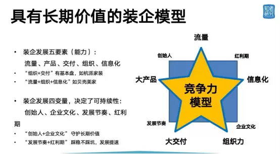 知者研究提过具有长期价值的装企模型:装企发展五要素(能力),即组织力、交付、产品、信息化、流量。另外,装企发展四变量(创始人、企业文化、发展节奏、红利期),决定了可持续性。