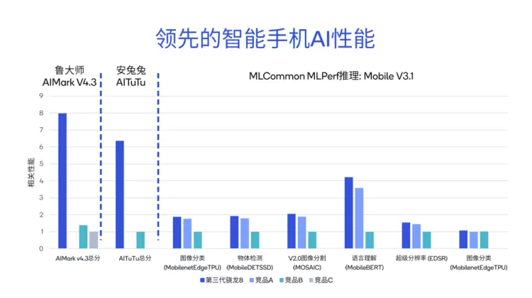 在安兔兔AITuTu基准测试中,第三代骁龙8的总分比竞品B高出6.3倍。针对MLCommon MLPerf推理的不同子项,包括图像分类、语言理解以及超级分辨率等,也进行了详尽的比较。