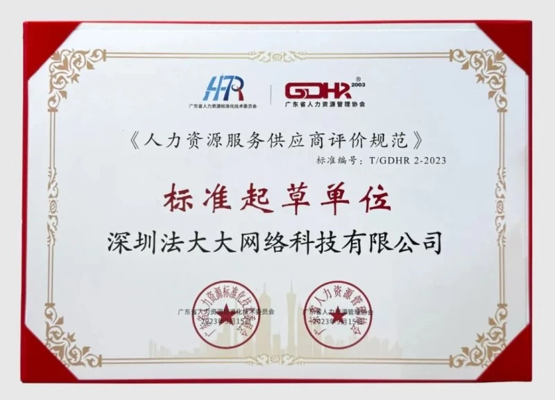 日前,广东省人力资源管理协会(以下简称“粤人协”)在全国团体标准信息平台发布《人力资源服务供应商评价规范》,法大大作为电子签行业唯一参编企业,被授予“标准起草单位”和“标准共建单位”称号。法大大联合创始人兼首席法务官梅臻作为标准的主要起草人之一,为标准制定提供了重要的理论与实践支撑。