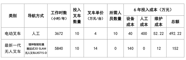 上表假定某仓库分别投入10辆电动叉车、以镭神智能轻量搬运式3D SLAM无人叉车LXST15-D为例,并以6年折旧进行投资回报对比分析。采用镭神智能LXST15-D无人叉车,6年总投入成本仅152万,比人工电动叉车节省了69%的投入成本、59%的时间成本。