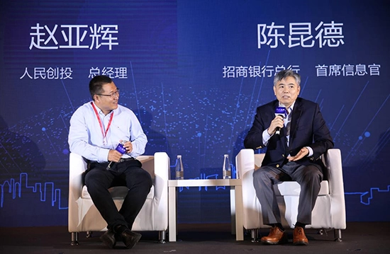 金融科技创新能给金融行业以及人们的生活带来什么样的改变?会上,人民创投总经理赵亚辉与招商银行总行首席信息官陈昆德进行了一场题为“‘智·链’金融,Fintech的应用创新”的“高端对话”。