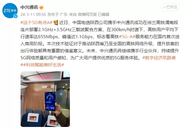 中兴通讯与中国电信合作 实现高铁5G-A商用服务新突破