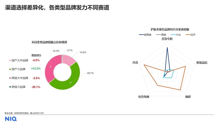因此,胡姗姗建议,品牌在选择渠道时应考虑差异化,针对不同的市场赛道采取相应策略。国产小品牌在国产护肤品市场增长方面扮演重要角色,23年通过抖音渠道迅速崛起,不仅在市场进入速度上有所突出,而且在产品迭代方面也取得明显优势。