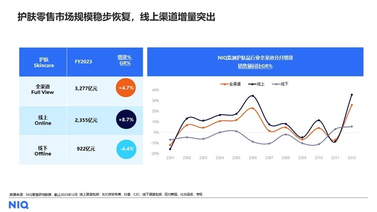 消费者对生活品质和护肤理念的提升推动了市场复苏,NIQ监测的护肤品行业全渠道数据显示,2023护肤品市场全年规模累计3,277亿元,同比增长4.7%,其中,线上渠道增速8.7%,线下渠道增速-4.4%。
