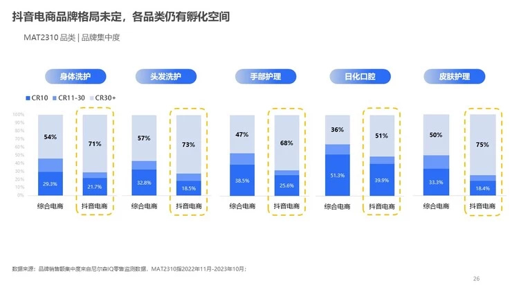 从品牌集中度来看,抖音电商是中小品牌的主要阵地,各品类仍有孵化空间。以皮肤护理为例,Top10的品牌在综合电商贡献了33.3%的销售额,在抖音电商只占18.4%。而排名30+中国本土中小品牌市场在抖音电商集中度均超过70%。