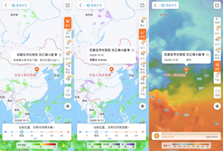 此外,墨迹天气的“气象云图”依托人工智能、大数据和LBS定位等前沿科技,结合传统气象技术,以可视化的方式,为用户提供了更加精细的气象服务。用户不仅可以使用此服务直观看到未来两小时的降雨情况,还可以通过滑动下方进度条查看历史8小时到未来48小时,自身实时所处位置的超清分辨率云雨图的变化趋势,进而极大程度减少突发天气情况所带来的诸多困扰。