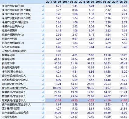 利润表的主要盈利能力指标,2018年上半年毛利率为49.91%,高于2017年半年度和2016年半年度,也体现了公司持续的研发投入,但是净利率只有4.21%,是多年以来的新低。新低的原因在于持续增长的销售费用率和居高不下的管理费用率。2018年上半年销售费用率为22.85%,是5年以来新高,而且持续提高,同时管理费用率为25.63%,3年以来新高。
