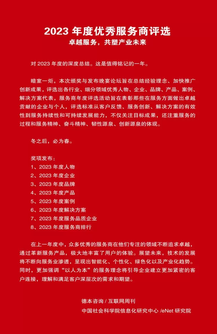 自2003年创办以来,“金i奖”已连续成功举办二十年,“金i奖”由权威科技媒体、科研机构、第三方专家、战略咨询/智库的中国科学院《互联网周刊》、中国社会科学院信息化研究中心、eNet研究院、德本咨询共同主办。每年围绕最重要和关键行业领域综合表现最优秀的企业、品牌、创新案例、解决方案和服务等多方面进行深度总结,评选出各行业和细分领域的优秀代表,并围绕中国经济的创新与发展开展高层次、多角度的剖析和讨论,旨在推动中国经济转型和高质量发展。