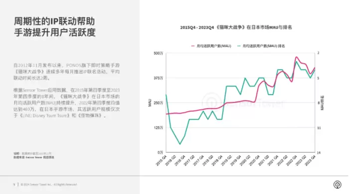 除此之外,来自Sensor Tower的《2023年日本手游市场IP联动趋势洞察报告》显示,IP对于移动游戏产品的增益效果极强,如多年来坚持IP联动的《猫咪大战争》,自2015年到2023年,其活跃用户数基于IP联动稳步提升,规模仅次于头部的《怪物弹珠》等产品。另外值得关注的是,基于网易旗下《荒野行动》和《第五人格》在日本市场的优异表现可以发现,IP联动能够促进出海游戏产品在海外市场的本地化,更得以显著提升内购收入。