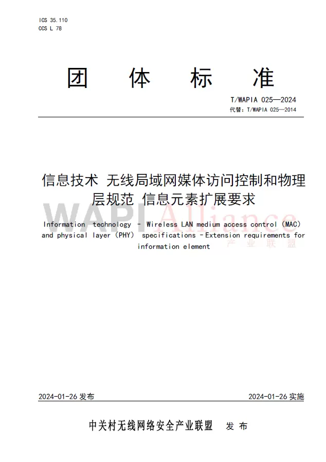 2022年,WAPI产业联盟下达了对T/WAPIA 025—2014《无线局域网信息元素扩展要求》进行修订的计划。修订后的标准规定了无线局域网管理帧中的厂商自定义信息元素扩展要求,提出了利用WAPI类协议OUI:00-14-72(十六进制)协助实现无线局域网技术的扩展,用于标识和扩展新的技术。