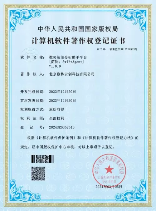 目前,数势智能分析助手平台SwiftAgent已经获得国家版权局颁发的计算机软件著作权。这是数势团队的又一崭新成果,呈现了数势对业务的深度洞察和对新技术的深刻理解,在助力企业数字化转型的道路上迈出了创新且坚实的一步。