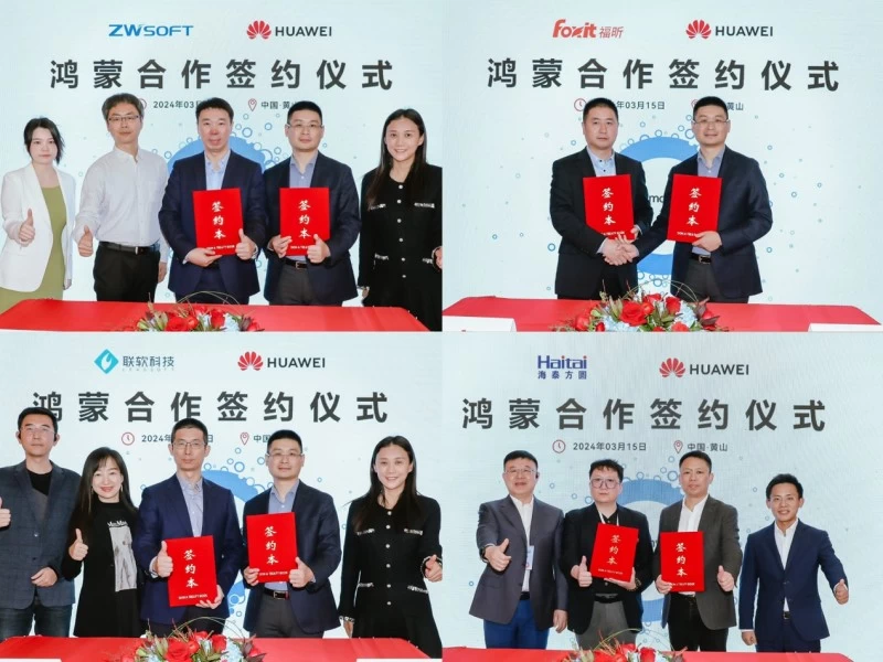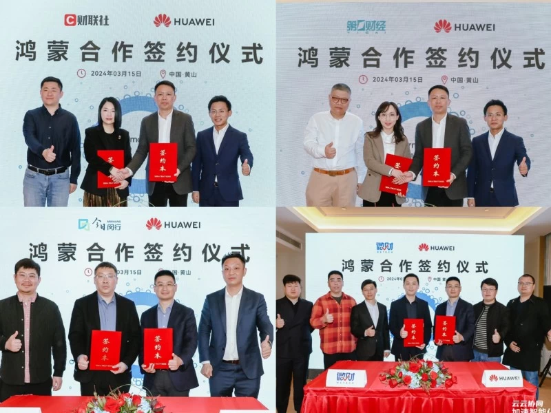 【3月15日,黄山】鸿蒙生态进入第二阶段,千行百业应用正加速鸿蒙化。在华为云&华为终端云 创新峰会期间,财联社、第一财经、今日闵行、好分期、中望软件、福昕软件、联软科技、海泰方圆8家合作伙伴与华为签署鸿蒙生态合作协议,宣布将基于HarmonyOS NEXT鸿蒙星河版启动鸿蒙原生应用开发。鸿蒙操作系统以其开放性、高效性和安全性,吸引了越来越多行业领先企业的青睐。本次签约的伙伴,覆盖了媒体资讯、生产力工具、金融、信息安全等领域,进一步加速了原生鸿蒙在多行业、多场景的落地应用,也为用户提供了更加多样化和专业化的服务。