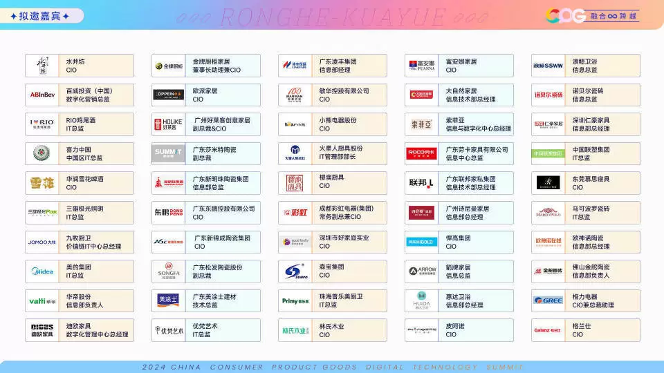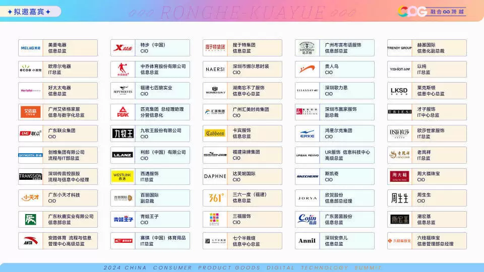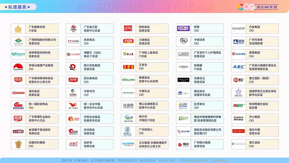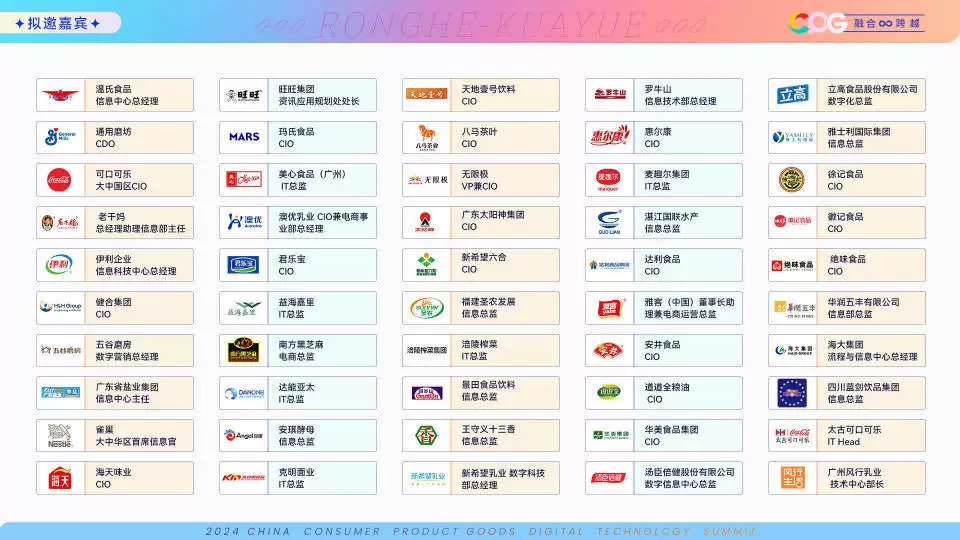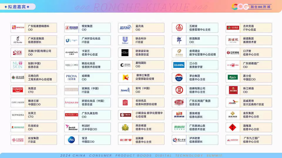 作为消费品行业信息化交流首选平台,CPG 组委会凝集前十届行业的精华与成功经验,将于2024年4月18-19日,在羊城广州举办CPG 2024第十一届中国消费品数字科技大会,会议将汇聚300+消费品行业知名企业高管、CIO、CDO、IT负责人、数字营销负责人、战略部负责人、以及行业知名信息化服务商,共同围绕“融合 跨越”这一主题,进一步增强消费品数字技术融合应用能力,助力提升各大品牌影响力,深度探寻消费品行业未来数字化机遇,构筑行业发展提效的新优势。