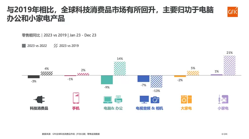 GfK全球(不含北美,以下同)零售监测数据显示,2023年全球科技消费品市场零售额同比下跌3%,其中电脑办公类和电视音频类产品下滑较为显著,同比跌幅均超过5%;手机和大家电市场平稳,呈小幅下跌趋势;而小家电市场表现相对较好,市场微幅增长。然而,对比疫情前的2019年,2023年全球科技消费品市场有所回升,零售额上涨4%。