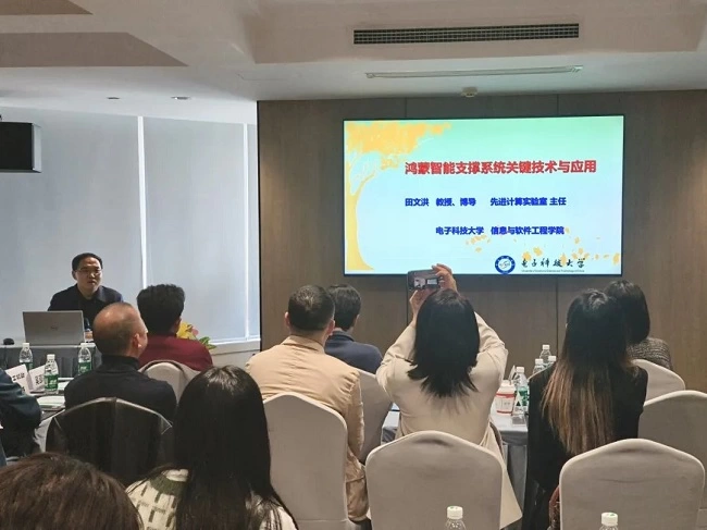 活动伊始,电子科技大学信息与软件工程学院教授、博士生导师、特色化先进计算实验室主任田文洪为现场嘉宾带来了“鸿蒙智能支撑系统关键技术与应用”主题分享,概述了鸿蒙和开源鸿蒙的主要技术特点与AI开发特性,介绍了鸿蒙智能支撑系统的关键技术与学院的主要创新研究成果,与现场嘉宾共同探讨典型AI技术应用与鸿蒙的发展方向。