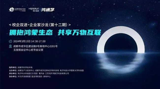 3月13日,由成都市科学技术局指导,成都生产力促进中心、成都市成华区新经济和科技局、电子科技大学国家大学科技园主办,电子科技大学科技园(沙河园)、蜀鸿会、江苏润开鸿数字科技有限公司(以下简称“润开鸿”)承办的“企业家沙龙”在成都圆满举办。本次主题沙龙以“拥抱鸿蒙生态,共享万物智联”为主题,润开鸿作为首批HarmonyOS人才生态体系服务合作签约伙伴受邀参会,与沙河科技园隆重签署“鸿通学”人才赋能合作协议,携手共推四川省鸿蒙生态人才培养与供给。来自电子科大沙河科技园开源创新中心主任徐枫、蜀鸿会创始人唐佐林、润开鸿生态市场总经理丽娜、鸿蒙生态服务公司拓展总监林丹妮等嘉宾以及成都建设路金融商务总部发展区促进中心、猛追湾街道办等政府、学校、企业、机构50余人现场参与。