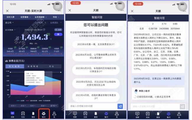 如下图所示,在某保险公司的实际应用中,神策分析 Copilot 作为一个智能问答组件融合进企业数据门户。在企业自身的数据门户上,用户点击“智能问答”,直接对话即可对数仓数据进行自助式分析和查询,进一步生成数据结果和报表,满足日常的业务观察需求。