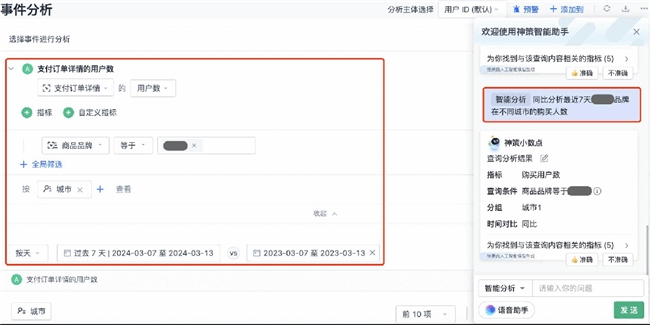 对于常规的数据分析和细粒度的看数需求,神策分析 Copilot 能够应用大模型技术理解用户问题,自动配置分析模型。业务人员只需通过自然语言和神策分析 Copilot 对话,无需理解复杂的数据分析模型。比如,针对“同比分析最近 7 天 XX 品牌在不同城市的购买人数”,业务人员只需要基于企业在分析系统中沉淀的业务知识进行回答和智能配置,即可轻松完成自助分析。