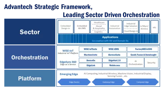 罗总进一步指出,研华下阶段成长非常重要的战略就是“Platform + Orchestration + Sector”的三层企业战略框架,即将既有的AIoT + Edge Computing边缘硬件平台产品群,加上已发展十年、逐渐成熟的工业软件平台,再加入各垂直产业的AI解决方案及行业知识,融合成为产业整合应用的协同共谱的经营模式。