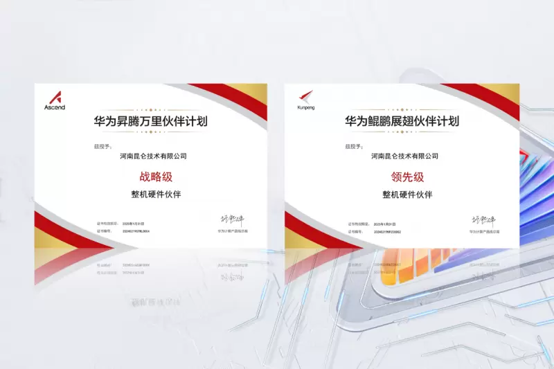 2024年2月,昆仑技术荣获“华为昇腾万里伙伴计划-战略级整机硬件伙伴”和“华为鲲鹏展翅伙伴计划-领先级整机硬件伙伴”双认证。