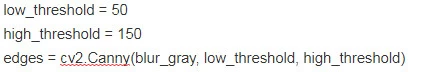 low_threshold 和 high_threshold 确定必须检测边缘的强度。如果梯度高于 high_threshold ,则将此梯度视为边缘的一部分,但是一旦检测到边缘,即使梯度高于 low_threshold ,下一个像素将被视为边缘。