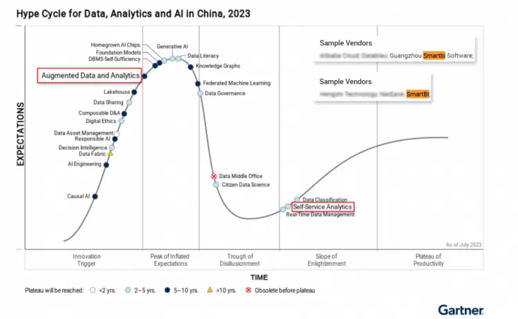 2023年,Smartbi把之前申请了NLA专利更好地产品化,发布了Smartbi对话式分析大模型版本。同年8月,Gartner发布《2023年中国数据、分析和人工智能技术成熟度曲线》报告,Smartbi凭借不断融合BI和AI增强型大数据分析产品,再次入选为增强数据分析代表厂商、与自助分析代表厂商,这也是Smartbi连续四年入选“Gartner增强数据分析代表厂商”。