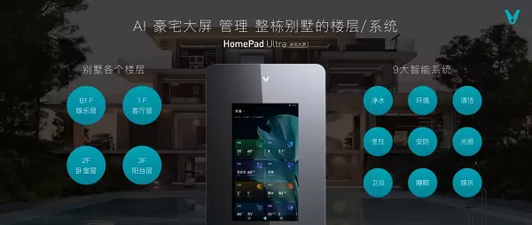 HomePad Ultra豪宅大屏适用于别墅的整栋控制,不仅完美搭配各式家居风格,还将全屋设备按系统分为净水、环境、清洁、烹饪、安防、光照、卫浴、睡眠、娱乐9大类别,不仅可一键启动对于各个楼层的设备控制,甚至实现车家互联,一键开车库、远程遥控充电,省心又省力。摄像头监控和AI异常实时处理功能,为居住安全保驾护航。