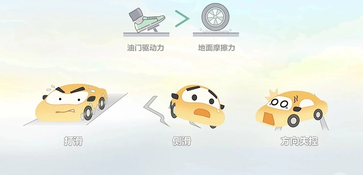 雪天,车轮与地面(冰雪)的摩擦力大大减小,当踩油门的时候,驱动力大于地面的摩擦力,车轮就会空转打滑,此时司机很难控制车辆,可能会原地打滑开不动,也可能会侧滑,甚至方向失控。老司机对雨雪天都很发怵,更不要说是新手了。