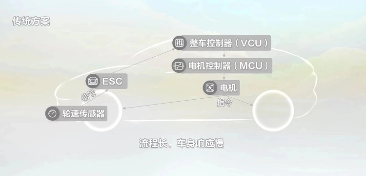如上图,在传统汽车底盘中,车轮感应到的信息会一层一层上传,经过ESC、VCU、MCU,再到电机,最后再由电机向轮胎发出指领。“整个过程要100毫秒左右。如果车速60Km/h,此时车又前进了将近2米。”显然,在阻力极小的雪地,信号与指令的传递必须毫秒必争。