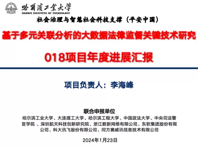 2024年1月23日,由哈尔滨工业大学牵头的国家重点研发计划“基于多元关联分析的大数据法律监督关键技术研究”项目2023年度项目进展报告会在杭州成功举办。