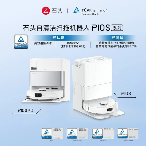 石头扫地机器人通过TÜV莱茵ETSI EN 303 645认证及高效边角清洁认证