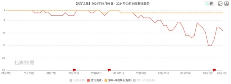 从iOS畅销榜最高排名来看,《元梦之星》在细分的家庭聚会游戏持续位列前茅。在总体畅销榜上,2月15号前仍算稳定,春节假期结束后流水有所下滑,但随着3月15号第三赛季启动,《元梦之星》又站上TOP10。