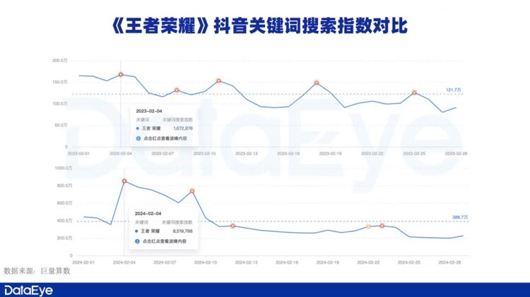 今年春节游戏市场的另一个重要变量是腾讯游戏与抖音的相互促成。以《王者荣耀》为例,今年张大仙等知名主播正式入驻抖音直播,《王者荣耀》在抖音平台的搜索量激增。巨量算数显示,《王者荣耀》今年2月份在抖音平台的搜索量峰值与去年同期相比增幅超400%。