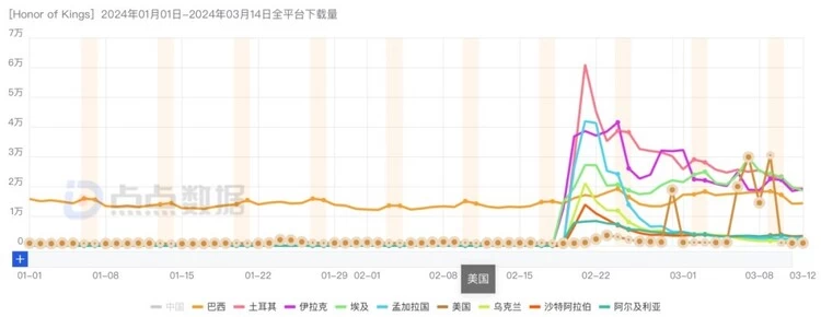 点点数据显示,2月21日, 腾讯天美工作室群旗下MOBA手游《王者荣耀》国际服(《Honor of Kings》)在全球57个国家和地区正式上线, 包含中东、北非、东欧、中亚和南亚等众多海外地区。