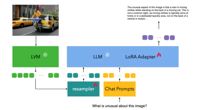 同时,为了更好的关联视觉特征和语言特征,模型整体包含了一个可学习的视觉特征采样器和语言模型的LoRA适配器。