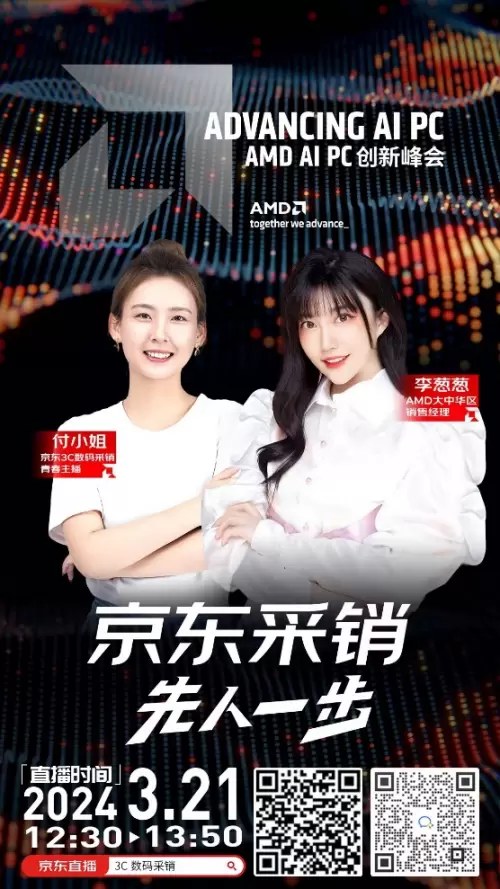 快速发展的AI技术在为人们生活带来便利和机遇的同时,也为各行各业的发展提供了AI加速度,满足消费者创造力和生产力的PC也成了AI落地应用的重要终端。3月21日下午14:00,AMD AI PC创新峰会将在北京香格里拉举行。而在峰会正式开启之前,京东3C数码采销付小姐将携AMD大中华区销售经理李葱葱,在12:30-13:50期间,提前在京东3C数码采销直播间,独家抢先逛一逛AMD AI PC创新峰会,并向大家先人一步曝光AMD最新的AI科技与AI装备,感兴趣的用户可在12点30分进入京东App抢先一睹新技术、新产品的魅力。