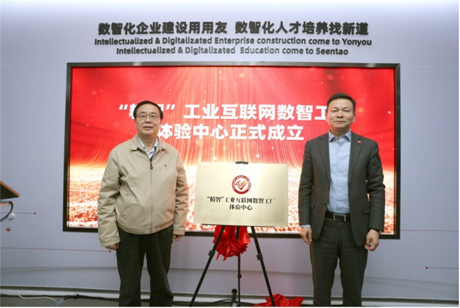 为深化产教融合,推动政行企校深入协同,发布会举行了“精智”工业互联网数智工厂体验中心揭牌仪式。中国教育技术协会监事长张少刚、新道科技股份有限公司总裁田鹏为中心揭牌。