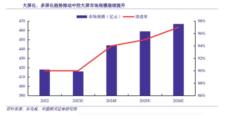 其中,车载屏大屏化成为重要趋势。当前中控大屏渗透率已达90%,在未来渗透率继续上行的基础上,屏幕尺寸的扩大以及单车屏幕数量的增加有望带动单车屏幕价值量的继续提升,据毕马威预测,中国中控大屏市场规模将从2022年的418亿元上升至2026年的467亿元,年均复合增长率3%,渗率将由90%进一步上升至97%。
