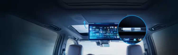 其中,副驾驶遮阳翻转屏,还加入了关键的驱动系统,可以自行调节角度,伸手就能控制,屏幕在可展开的范围内可任意调节角度,很容易找到舒服的位置,而其中关键就是微型驱动系统。