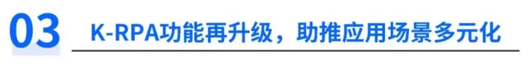 K-RPA此次升级主要包括四个功能:指引式向导、版本隔离、前瞻元素检查、智能录制,全面提升了RPA的多元交互能力、系统的稳定性和可靠性,从而大幅降低用户学习成本,进而改善用户体验。