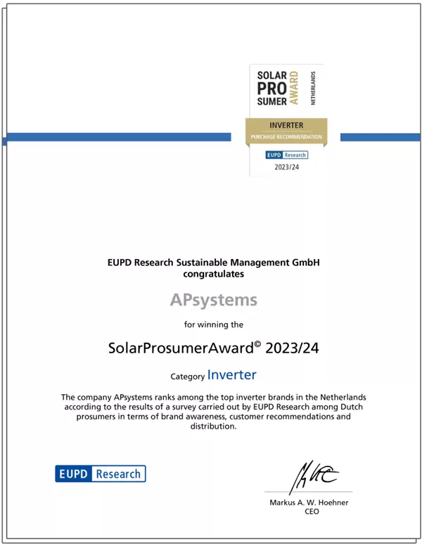 EUPD Research是全球太阳能行业最具权威性市场调研机构之一,其设立的“SolarProsumerAward”奖项是基于对安装商、经销商、终端用户等行业专业客户的多层次民意调查和分析进行评选,其评选标准涵盖产品质量、品牌满意度、品牌忠诚度等多个维度,具备极高的专业度和认可度。此次昱能科技荣获荷兰地区逆变器领域的SolarProsumerAward奖项,体现了昱能微型逆变器产品的领先实力,也证明了昱能品牌在荷兰等欧洲市场的强大影响力。