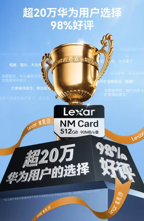 随着Lexar雷克沙携手华为等知名企业不断将NM卡等存储卡拓展至更大容量,消费者的存储体验也将进一步被刷新。此外,随着华为荣耀的手机平板销售热度持续走高,NM存储卡也获得了越来越多的关注。京东作为备受消费者信赖的3C数码新品首发聚集地,在全渠道NM存储卡的销售方面一直保持领先,本次也携手Lexar雷克沙等国产存储品牌为消费者带来更快的上新速度和更完善的服务,并成为Lexar雷克沙行业第一款1TB NM存储卡的先人一步全球首发渠道,感兴趣的消费者可以关注京东购买。