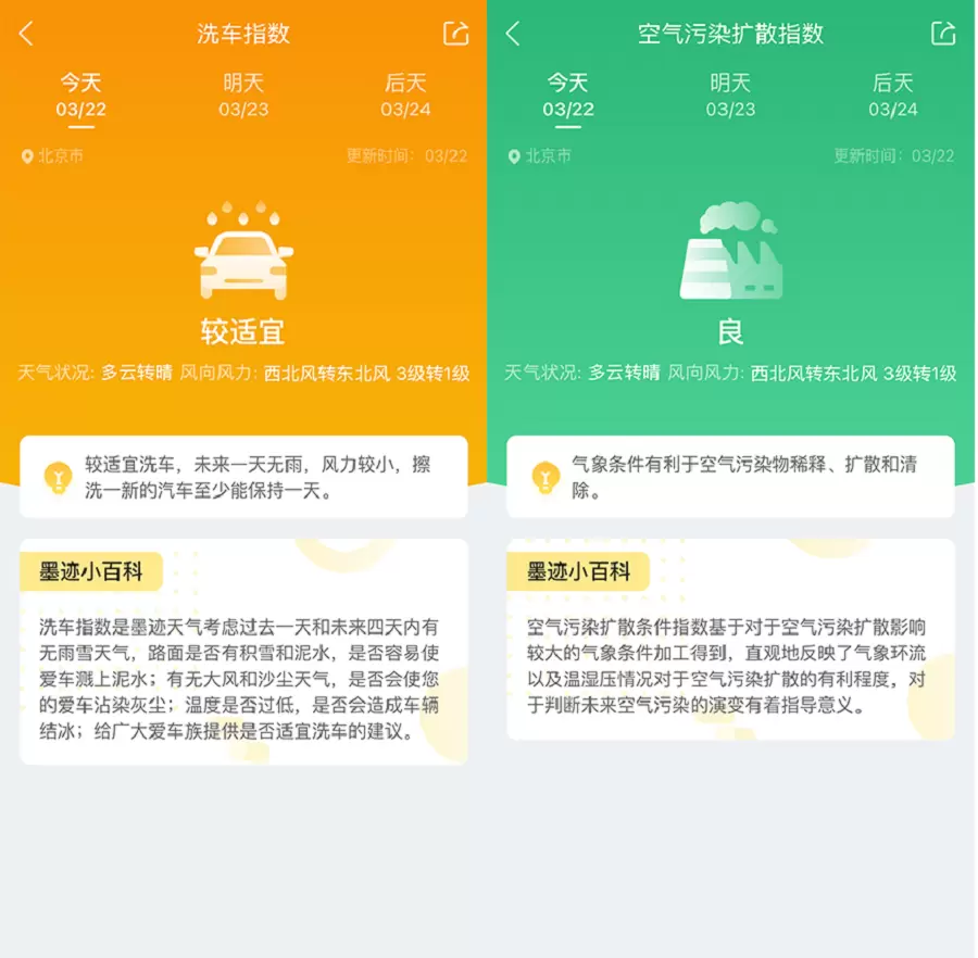 聚焦功能服务,墨迹天气通过细分站内天气预报和生活服务功能,传递节能减排环保理念,并引导用户合理利用天气特征出行和生活。例如,限行指数会提醒用户为缓解城市拥堵、减少尾气排放而选择低碳出行;当预测到未来24小时内有降雨时,洗车指数会贴心提醒用户今日不宜洗车,给用户带来方便的同时也减少了水资源的浪费;空气污染扩散指数、AQI地图等功能在给用户提供空气质量参考的同时,也潜移默化地唤起用户关注周围环境的意识。