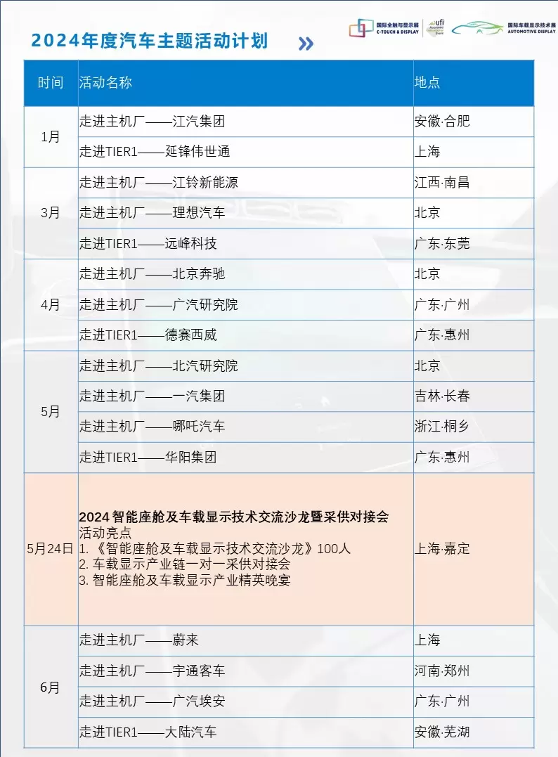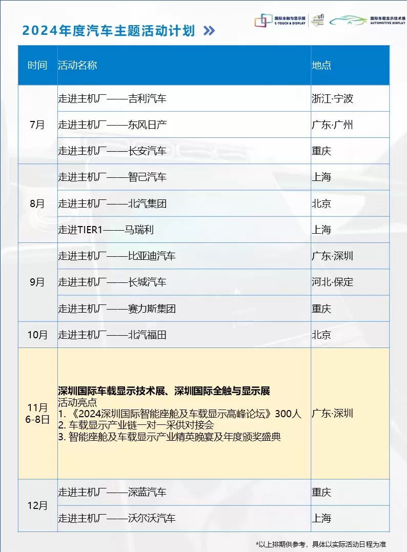 2024年深圳国际全触与显示展、深圳国际车载显示技术展将持续关注智能座舱及车载显示产业高质量发展,精心打造走进主机厂、上下游采供配对会、智能座舱高峰论坛、国际商务交流等一系列特色活动,助力显示企业与汽车产业的高度融合。