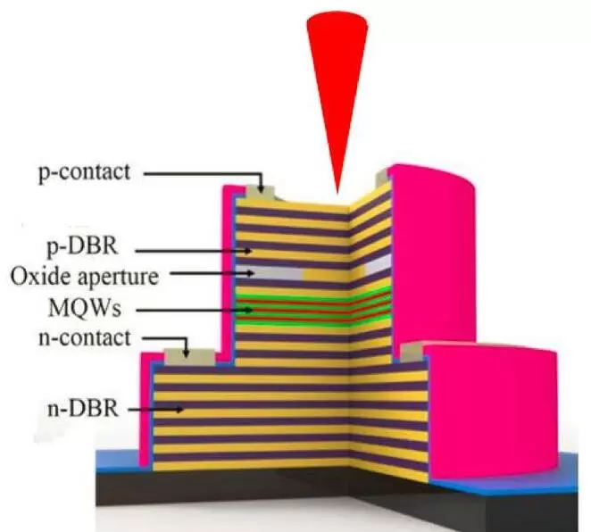 VCSEL,全名垂直腔面发射激光器,以砷化镓半导体材料为基础研制,有别于LED和LD等其他光源,具有体积小、圆形输出光斑、单纵模输出、阈值电流小、价格低廉、易集成为大面积阵列等优点,广泛应用与光通信、光互连、光存储等领域。