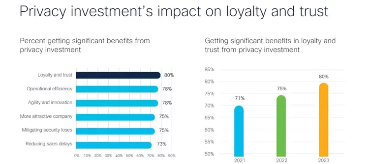 过去五年中,企业在隐私保护方面的支出增加了一倍多,收益呈上升趋势,保持强劲回报率。今年,95%的企业表示隐私保护的收益超过了成本,平均每个企业的隐私保护收益是其支出的1.6 倍。此外,80%的企业表示从隐私保护方面的投资中获得了显著的“忠实度和信任度”,而在隐私保护投资最成熟的企业中,这一比例甚至更高(92%)。